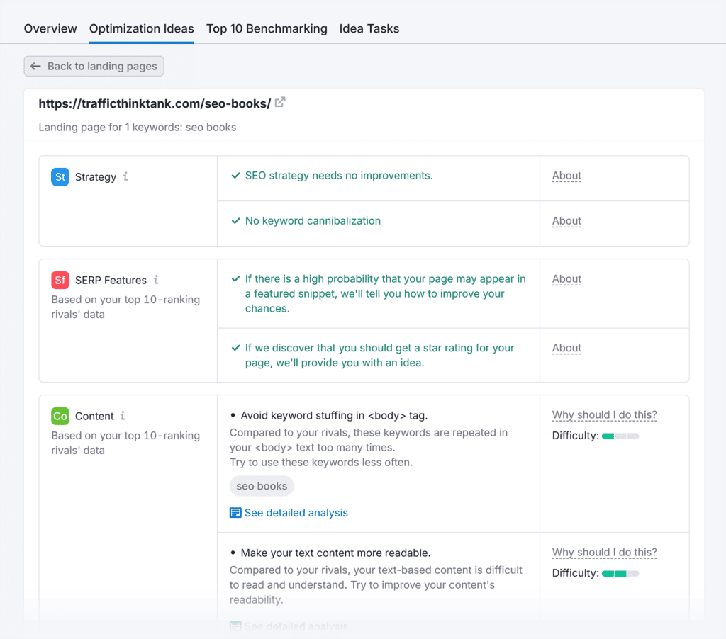 Click the “Ideas” button next to any page to see detailed recommendations on how to improve its SEO performance.