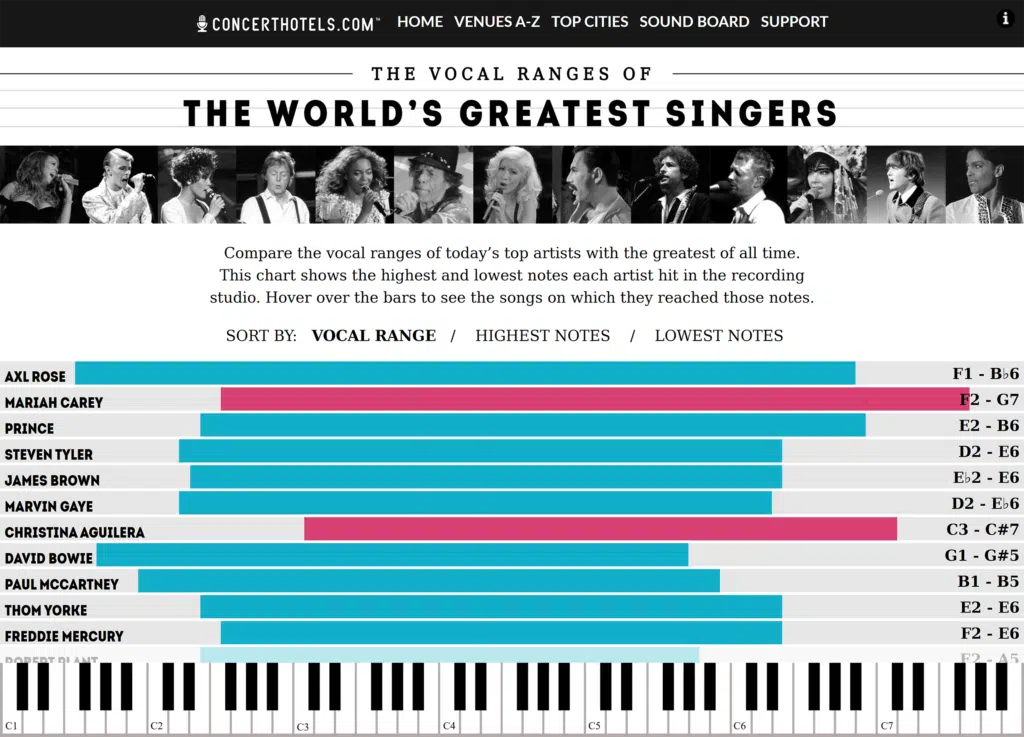 What they did: In this (old but gold) example from 2014, Concert Hotels published an interactive infographic showing the vocal ranges of popular singers. Based on his vocal range, it declared Axl Rose the greatest singer of all time.