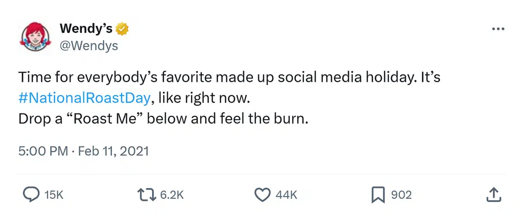 One example is their participation in “National Roast Day,” where Wendy’s invites followers to request a roast, sparking viral interactions.