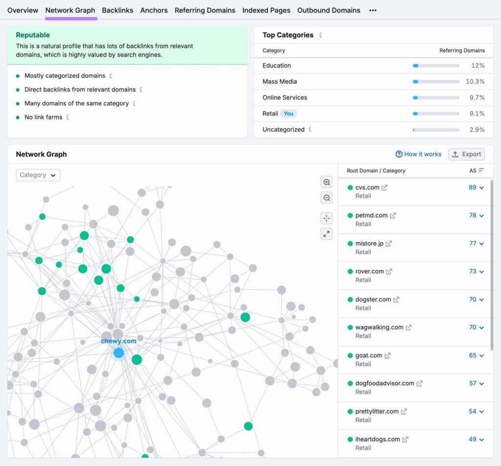 Use the “Network Graph” tab to quickly evaluate a domain’s backlink profile. And identify private blog networks and irrelevant domains that you don’t want links from.
