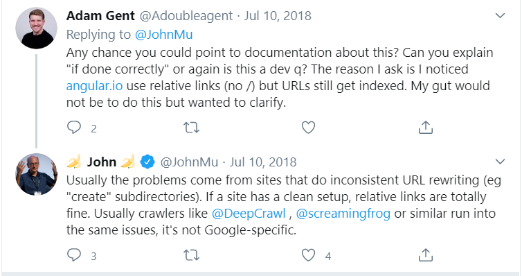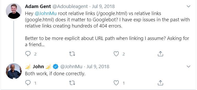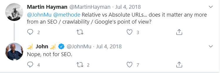 Internal linking plays an important role on the site. Therefore, you need to pay attention to how you use the internal linking tags. There is a rumor in the SEO community that relative URLs occasionally lead to a huge number of 404 errors. John Mueller refuted this idea. The SEO specialist claims that a properly configured link will be read by Google bots anyway. It doesn’t matter if it is relative or absolute. Errors will start to appear anyway if there are inaccuracies when setting the URL.