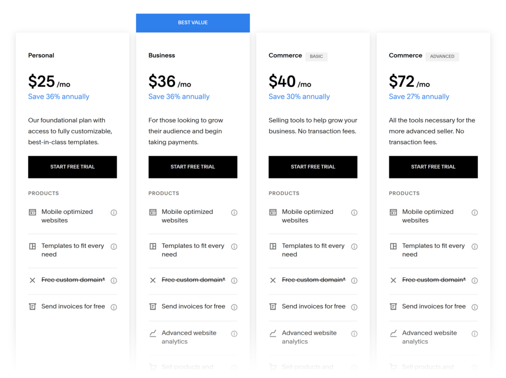 To sell products and services through a Squarespace website, you need to subscribe to one of the more expensive plans. There’s a 3% transaction fee unless you opt for the Commerce Basic or Advanced plans.