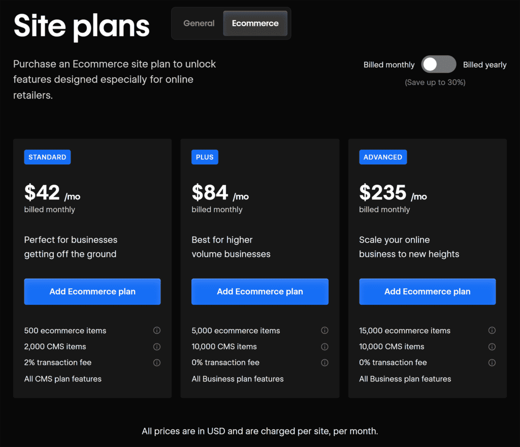 - Advanced: $235 per month. Add 15,000 ecommerce items and have up to 10,000 CMS records. 0% transaction fees.