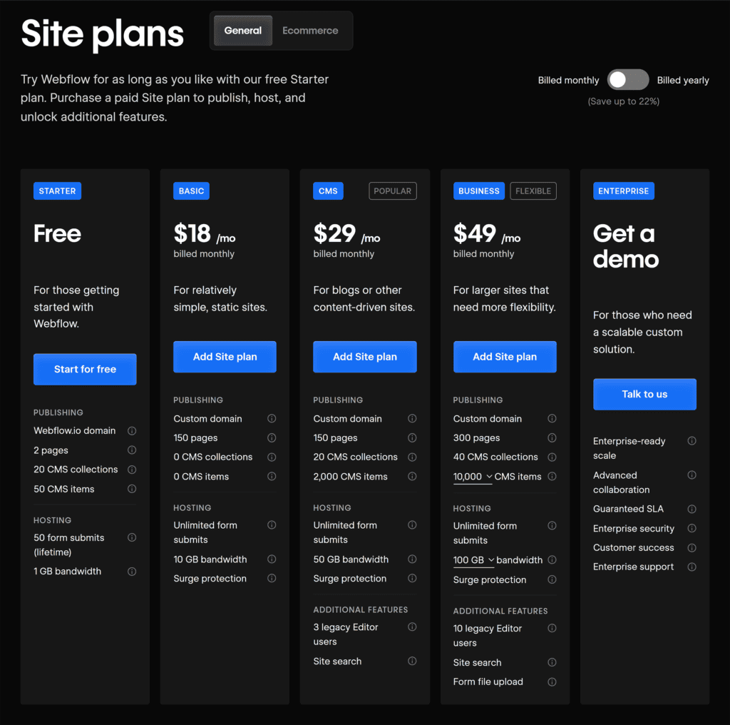 - Starter: Free. Build an entry-level website on a Webflow.io domain limited to 1,000 visitors per month. Have two static pages and 50 pieces of content (like blog posts, menus, and product descriptions) in your content management system (CMS). Collect 50 form submissions (lifetime).