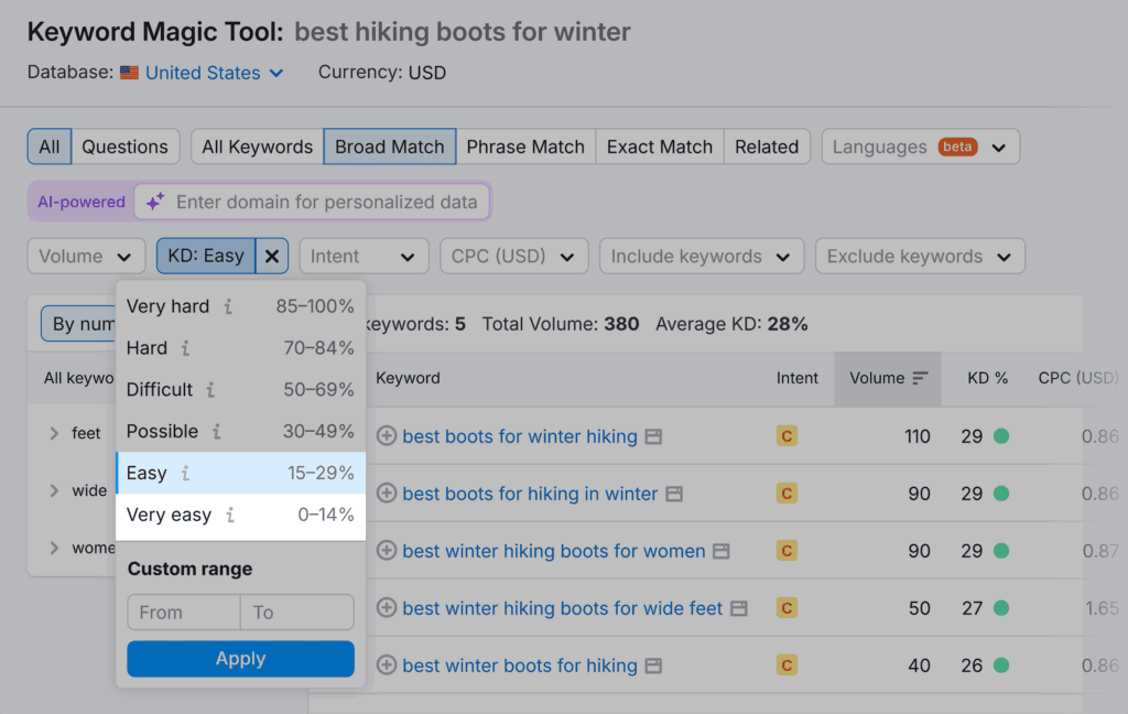 - Keyword difficulty: How hard it is to rank on Google’s first page for a term, usually scored 0-100. Higher scores mean tougher competition.