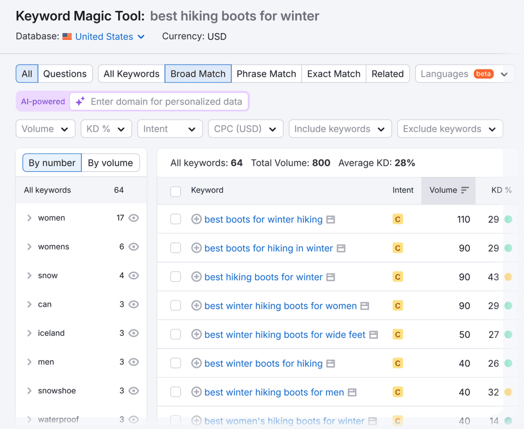 - Search volume: The number of times a keyword is searched monthly. Higher isn’t always better since specific terms often convert better.