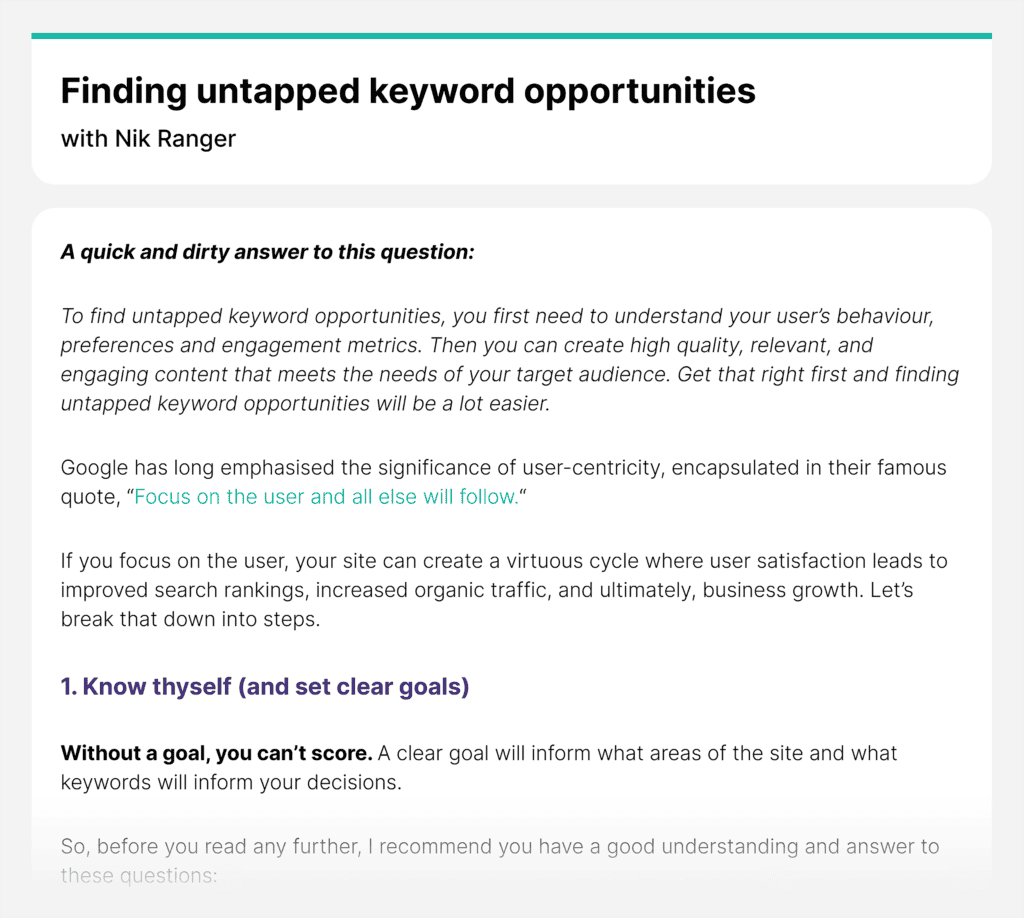 TTT has an excellent course on “How to find untapped keyword opportunities,” where Nik Ranger, a technical SEO expert, teaches you how to conduct keyword research.
