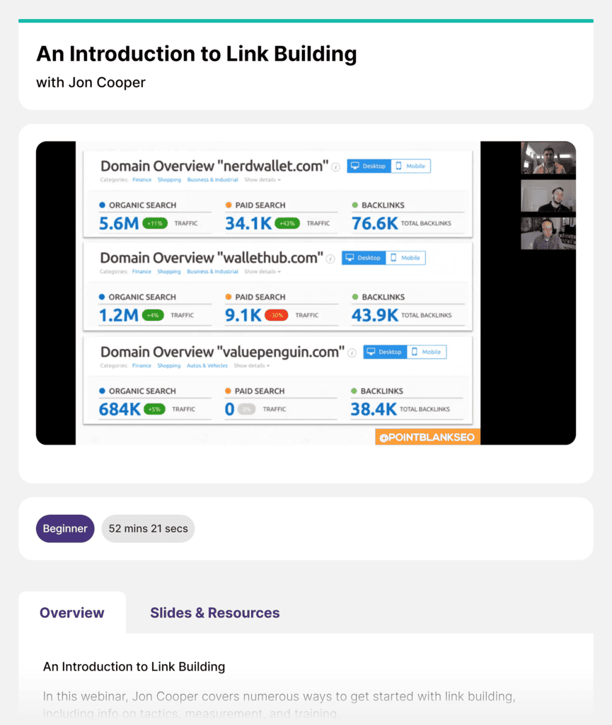 - Traffic Think Tank Academy: A paid subscription provides access to expert-taught tutorials and courses on link building, technical SEO, and much more. You’ll get content for every skill level, from beginner to advanced, so you’ll never run out of things to learn and level up on.