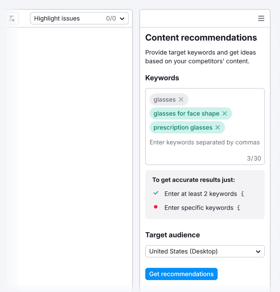 You can get recommendations with Semrush’s Site Audit tool. It performs over 140 on-page and technical SEO checks to flag issues with: