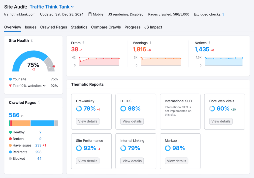 Run a site audit to review and optimize your internal links. A tool like Semrush’s Site Audit can help you with this task.