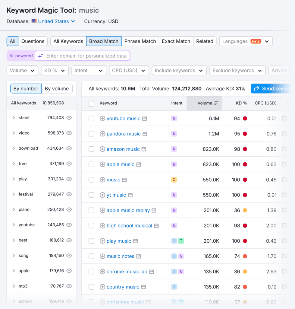 Semrush’s Keyword Magic Tool can help you identify the right keywords to bid on in your paid ad campaigns.