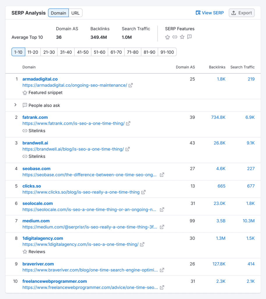 But some SERPs might be made up of domains with lower authority, including long-tail keywords like “is seo a one time thing”: