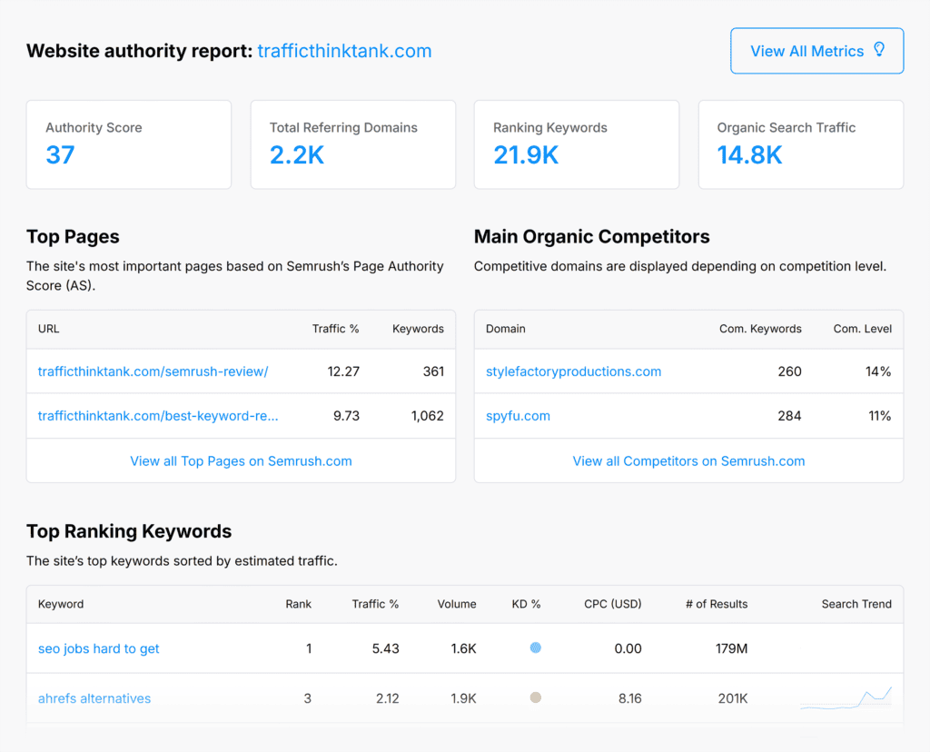 For example, while tools like Moz and Ahrefs might only take into account the link profile of your website, Semrush also takes into account your traffic. The idea is that a site is only truly “authoritative” if it also drives decent traffic.