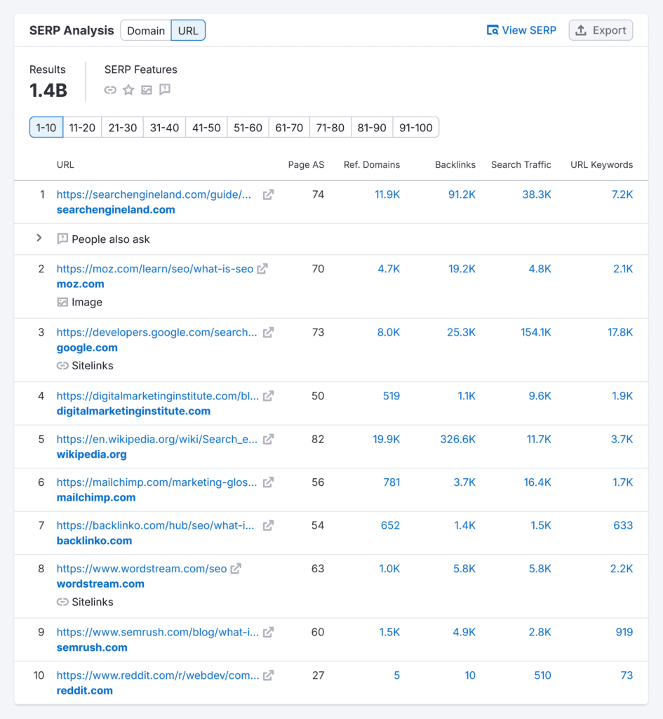 Website authority can serve as a quick check to understand which search terms you’re likely to rank for, and which ones you’re not. Ultra-competitive keywords, like “what is SEO,” will have search results packed with sites with high authority scores.