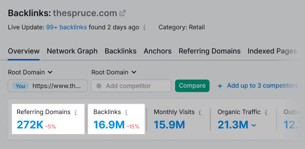 Here, you can see home styling website, The Spruce, has impressive authority, supported by a high number of backlinks.