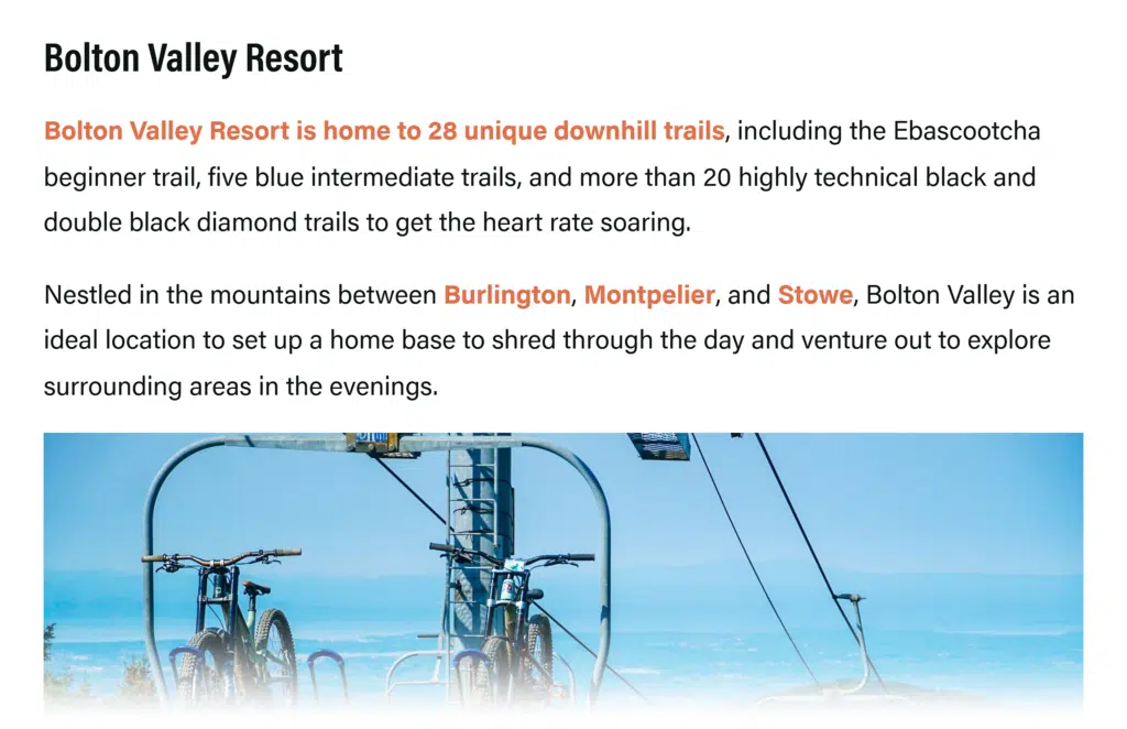 For example, Gear Junkie, an outdoor news and gear review site, included a mention of Bolton Valley Resort in a blog post (along with a link to the resort’s site).