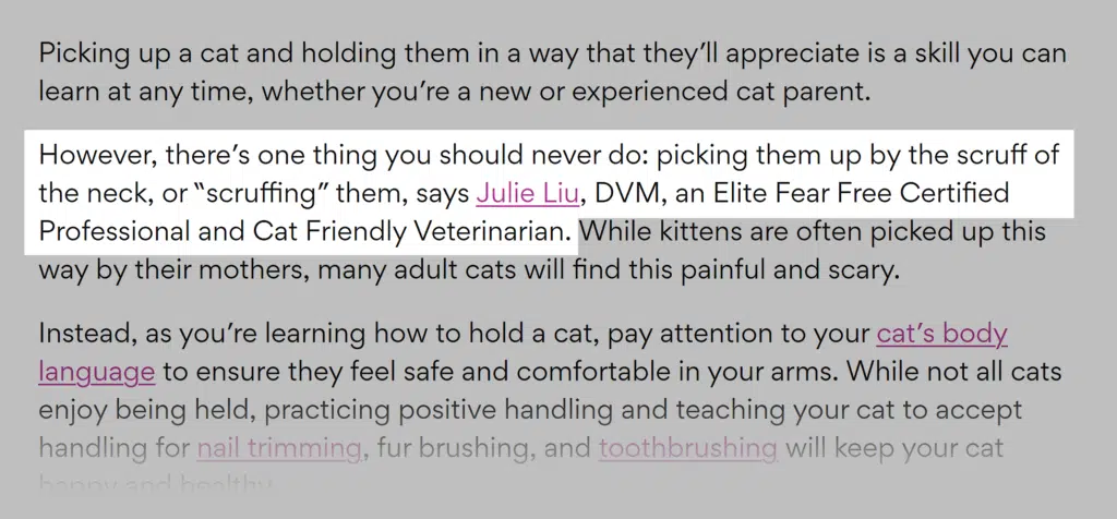 For example, this article on Chewy.com includes an expert quote from a veterinarian and a backlink to their website:
