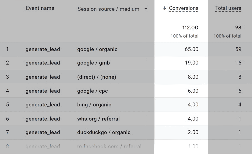 Navigate to “Reports” > “Engagement” > “Conversions” to view your site’s performance across different conversion types.