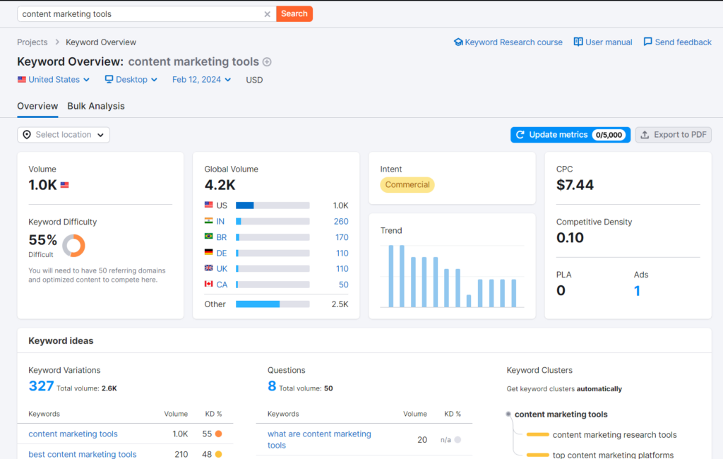 - Semrush: Use Semrush’s comprehensive toolkit to find and refine keywords that draw in your target audience and improve your content’s effectiveness. This can lead to better engagement, alignment with your audience’s needs, and, ultimately, maximizing your return on investment (ROI).