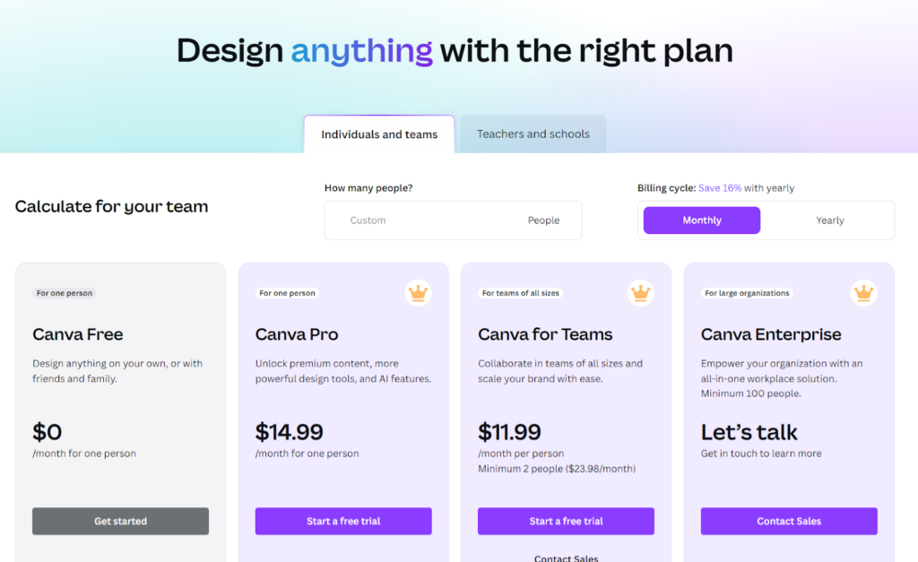 - Canva for Enterprise: Price not listed, 100 people minimum.