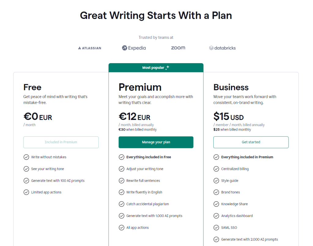 Price: Starts at $20 per user per month, with a free option for access to version 3.5 only