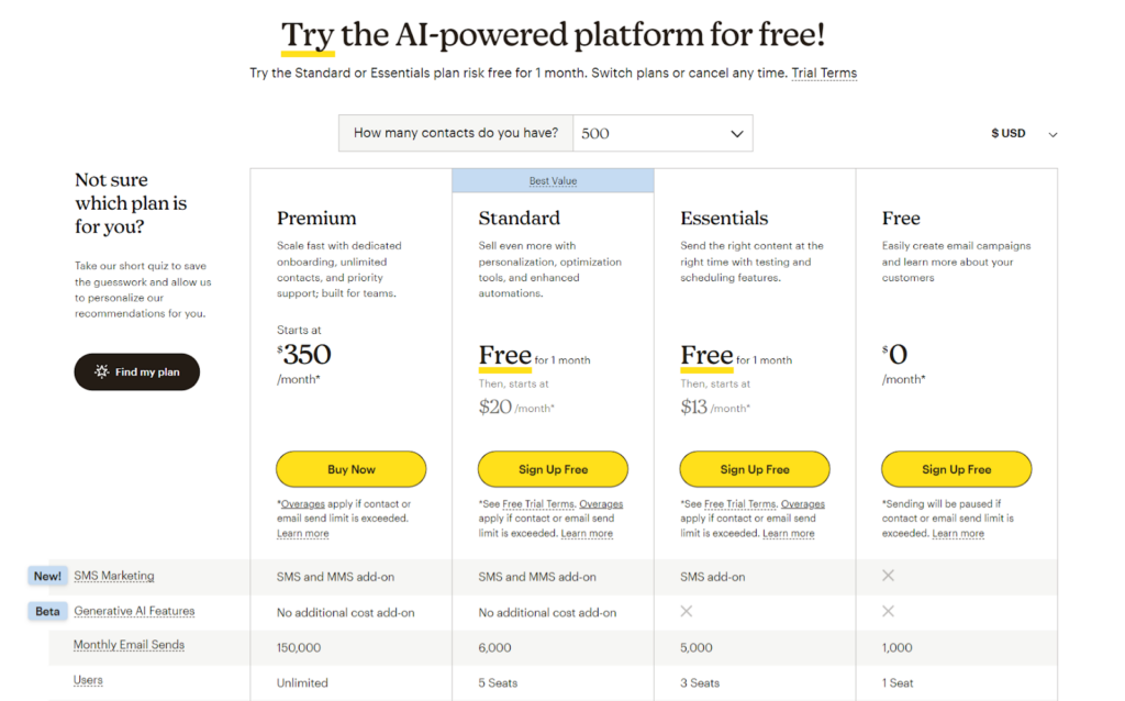 - Prices are for accounts with up to 500 contacts, with costs increasing as your subscriber list grows.