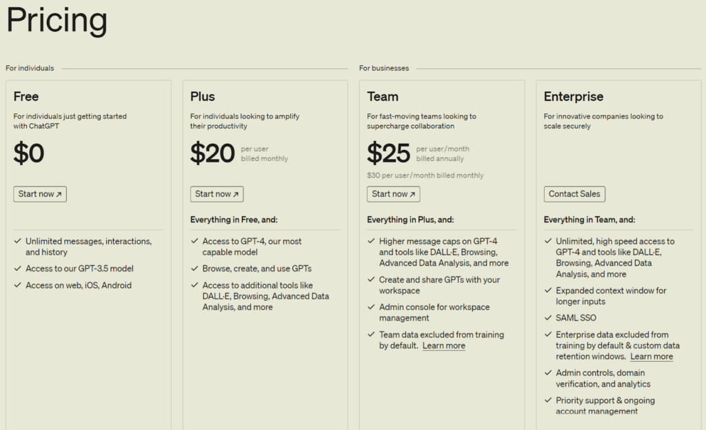 - Plus: $20/per user per month. Access to GPT-4 with some limits