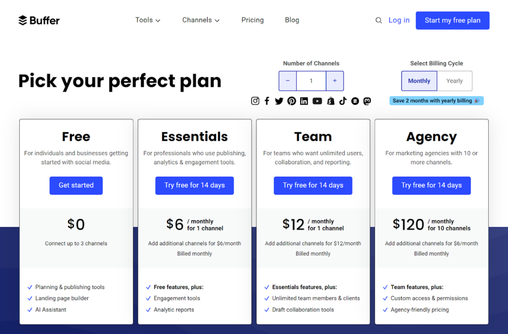 - Essentials: $6/month, includes engagement and analytics for 1 channel