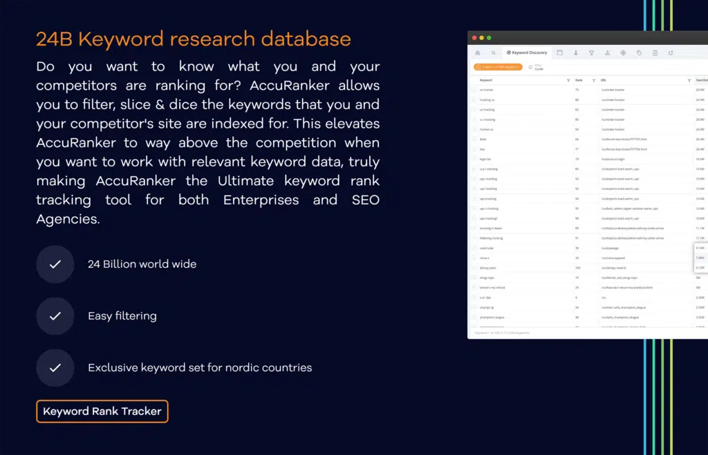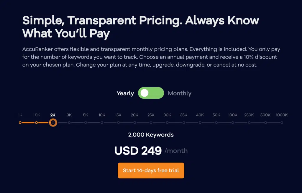 AccuRanker’s pricing model counts each keyword, device, and location combo as a unique keyword. This can add up quickly if you’re tracking across multiple devices and regions.