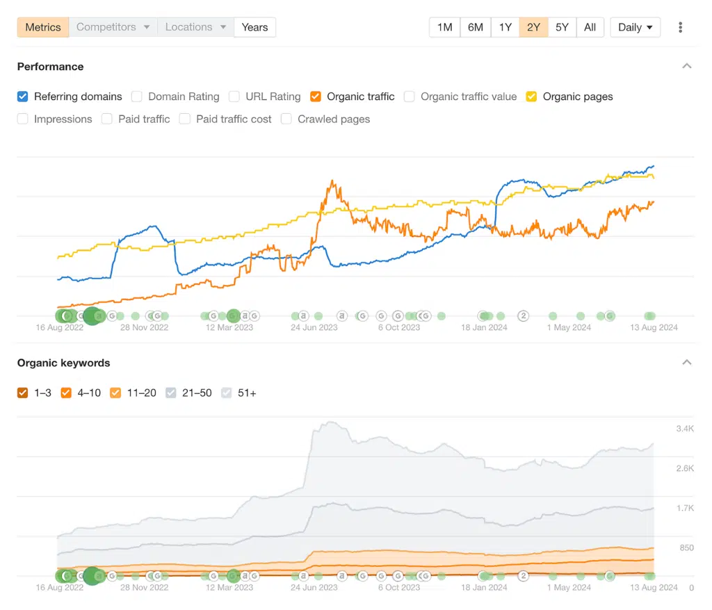 Additionally, Ahrefs allows you to examine the connection between your website’s organic traffic and the number of indexed pages.