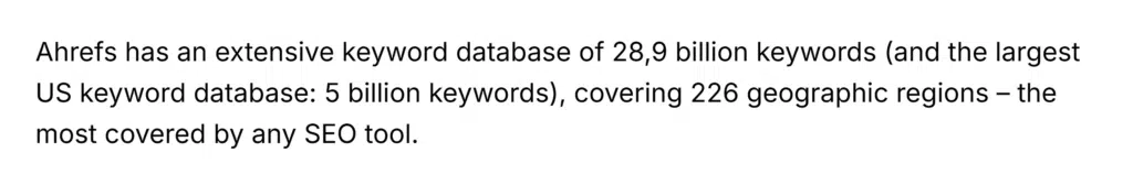 Ahrefs claims an even larger keyword database than Semrush, with 28.9 billion keywords. This means potentially more keyword suggestions, helping you discover more relevant search terms for your SEO campaigns.
