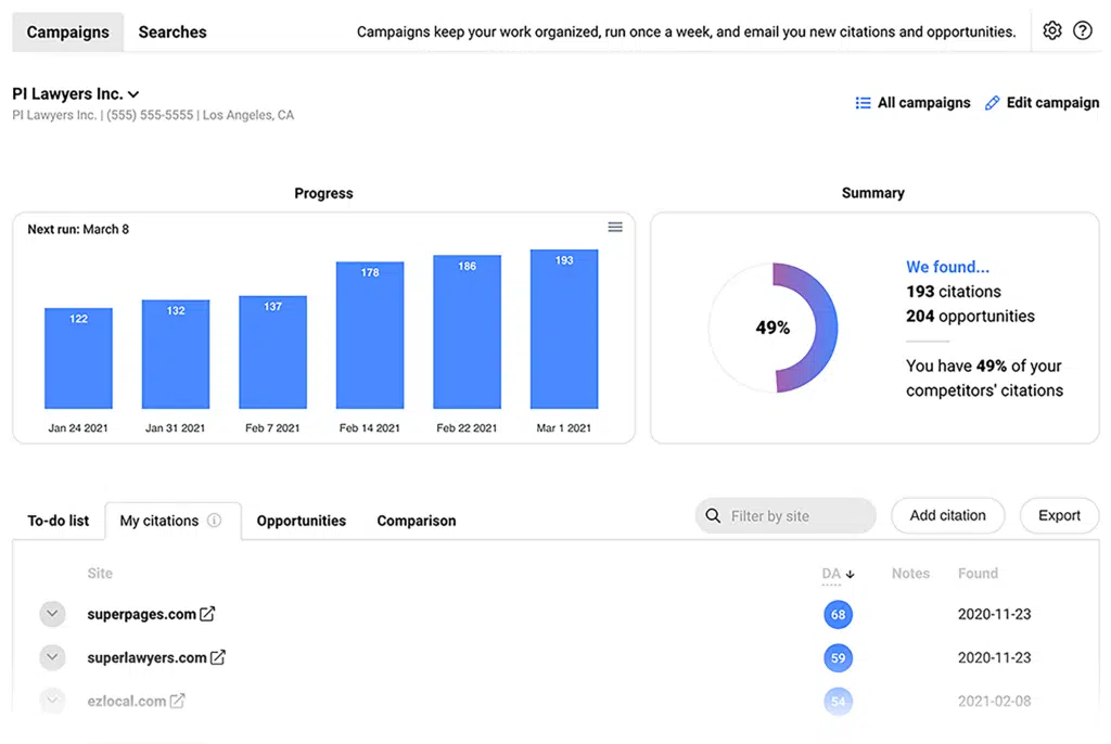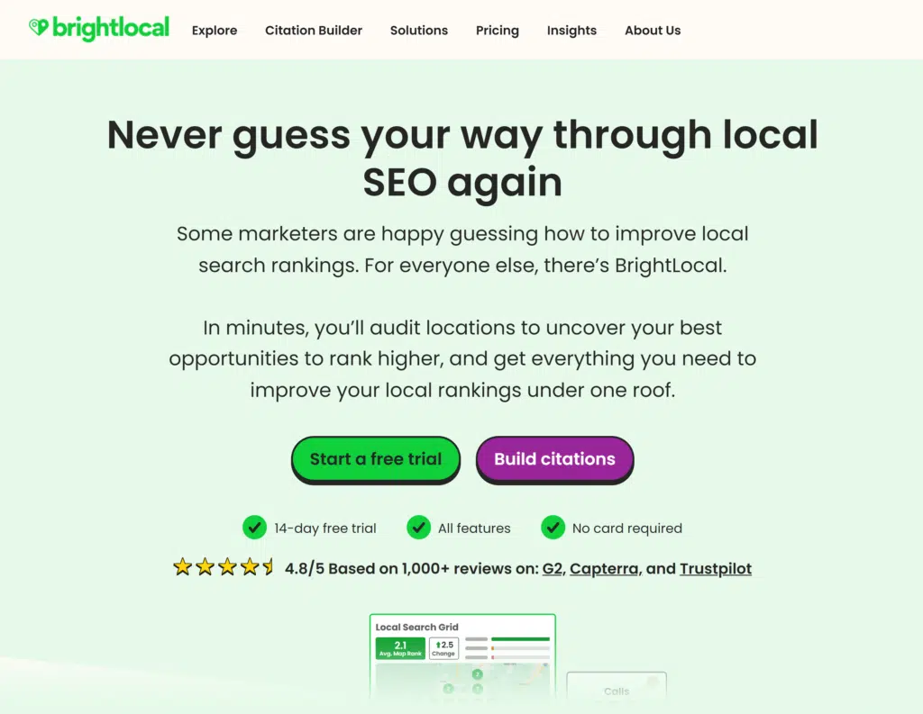 It offers a suite of features, including local SEO audits, citation building, review management, and rank tracking.
