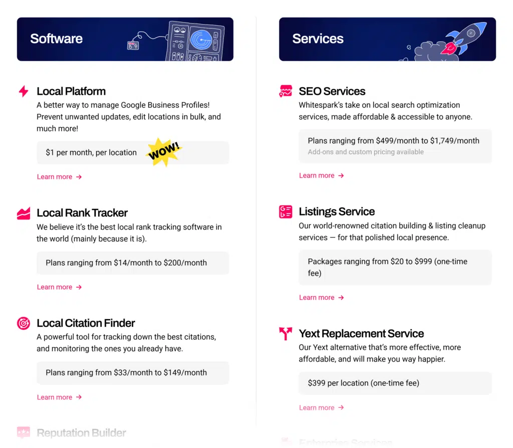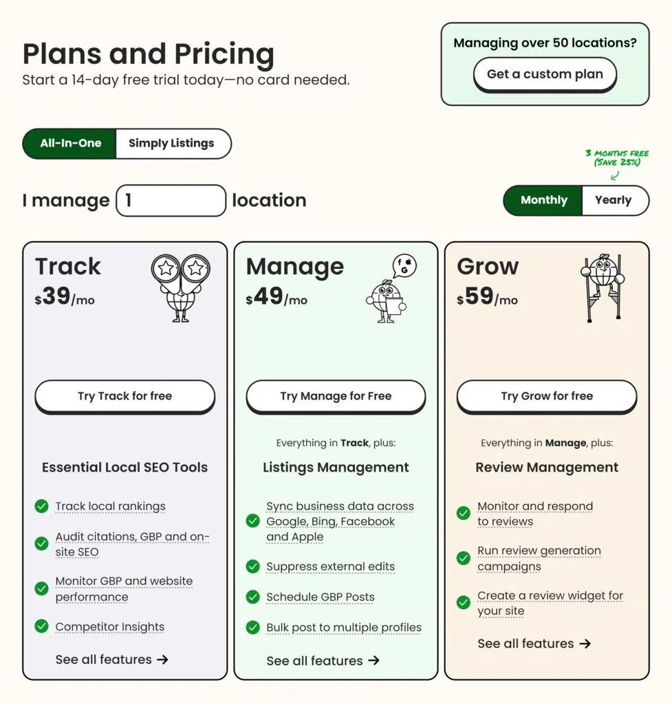 For example, managing a single Google Business Profile is just $1 per month. Rank tracking starts at $14 per month, and local citation monitoring starts at $33 per month.