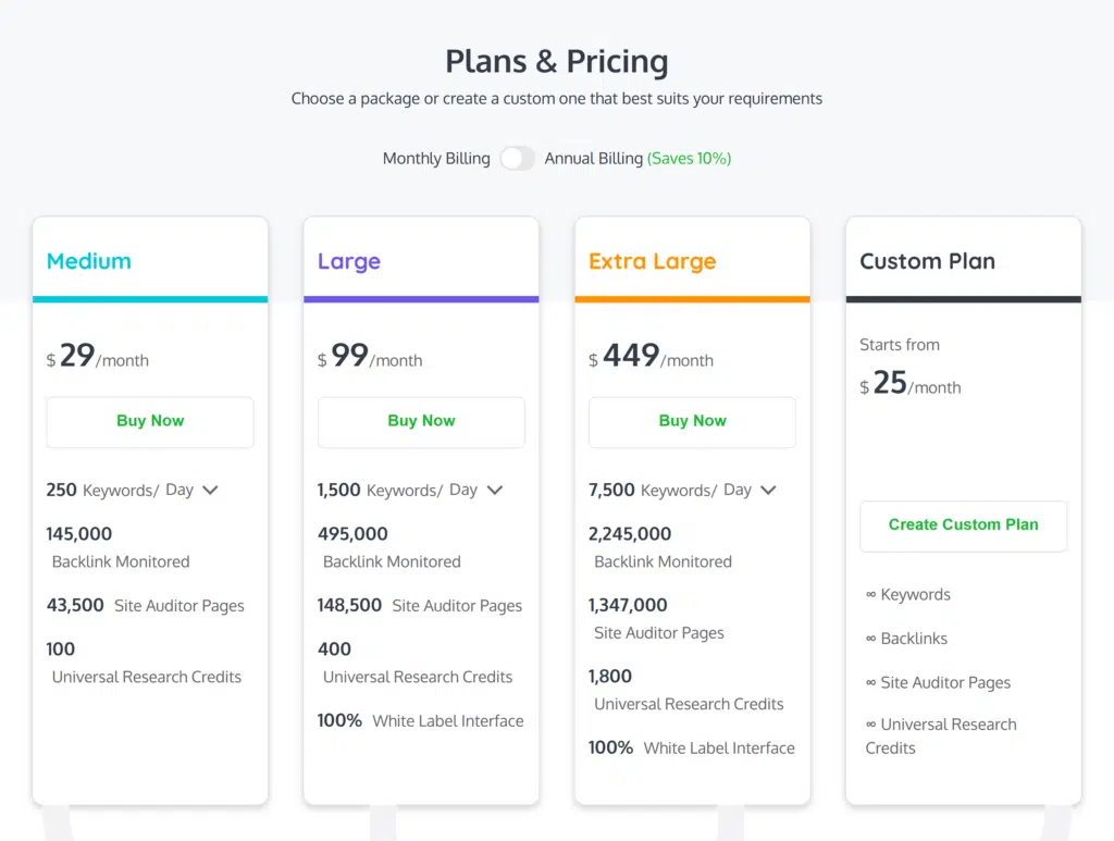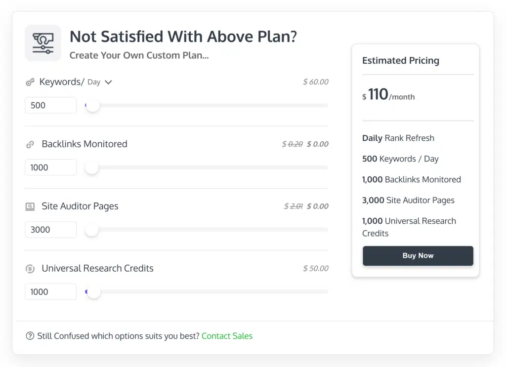 If none of the existing plans fit the bill, you can create your own. Select how many keywords and backlinks you want to track for a custom price.