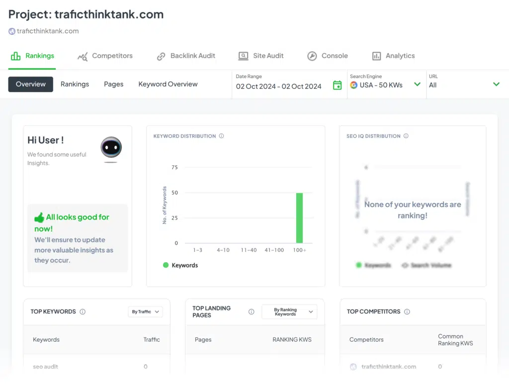 RankWatch’s ranking reports are concise and informative. You get a clear view of keyword performance, distribution, and top landing pages.