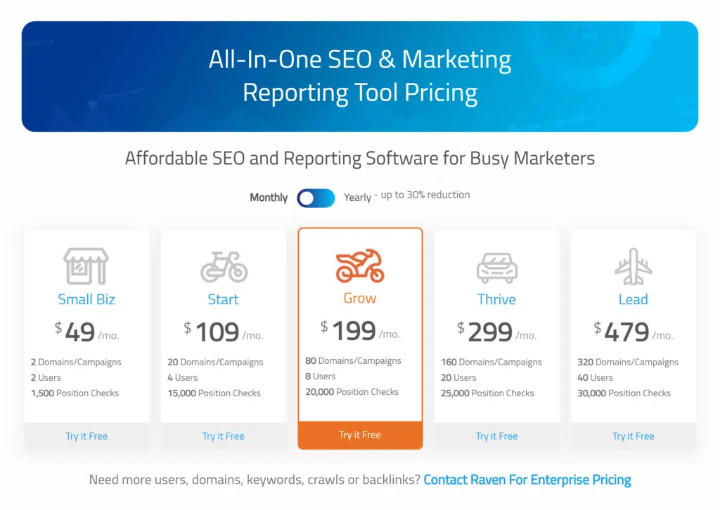 There’s no free version of Raven, so if you want to use it, you’ll have to pay for one of their five plans. Small Biz is the most affordable plan, costing $49 a month.