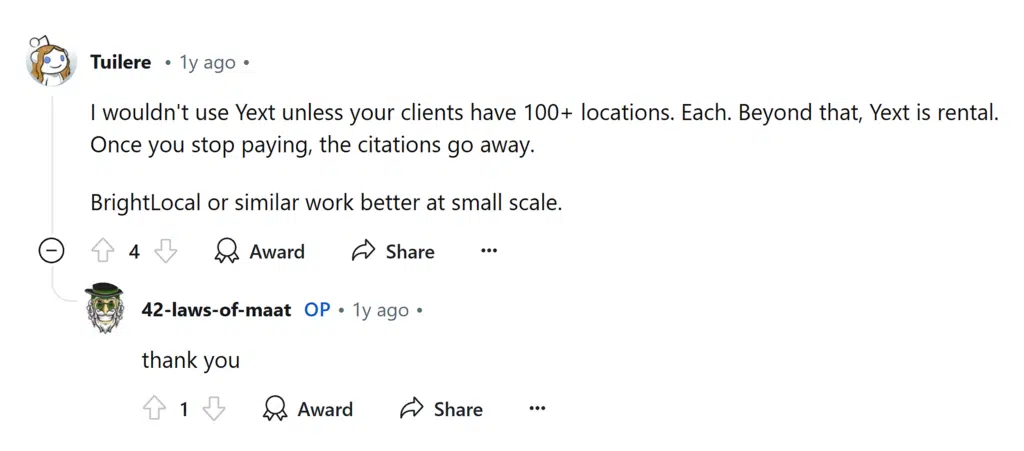 One user even claimed that Yext’s citations are temporary and might disappear if you stop using their service.