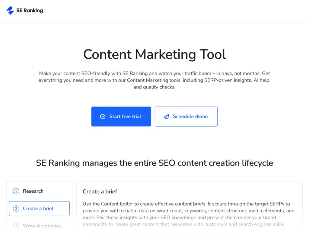SE Ranking goes beyond SEO with content creation and management tools. This includes features for topic research, content optimization, SEO brief creation, and SEO performance tracking.