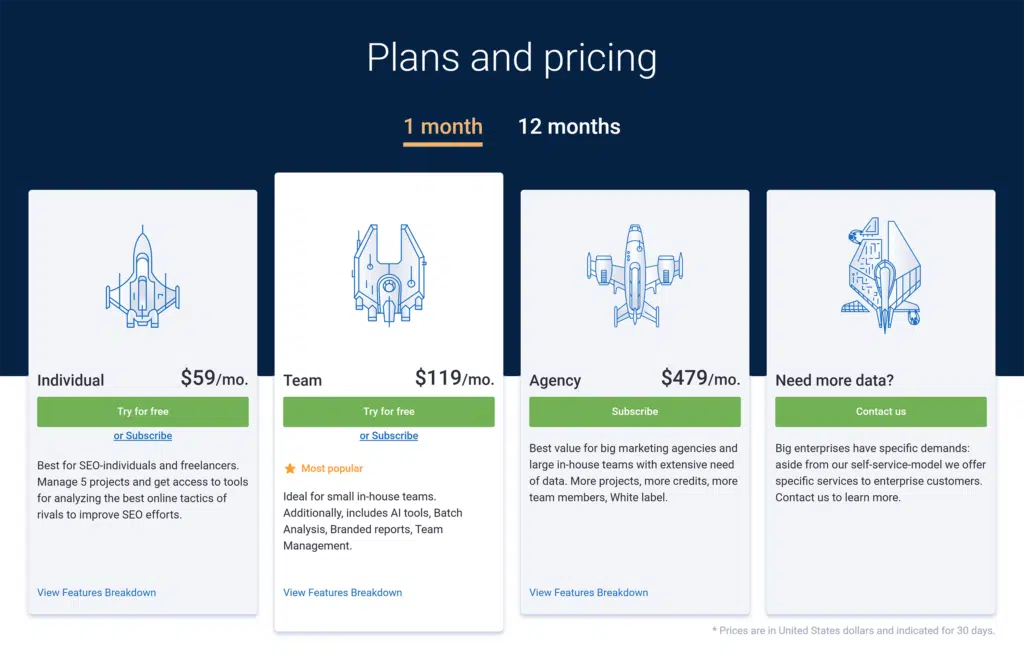 The most affordable monthly plan costs $129. But it does not include some key features for content management, broken link-building tools, and content gap analysis.