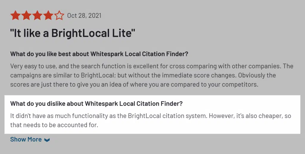 Some users report that WhiteSpark lacks citation features compared to other local SEO tools like BrightLocal.