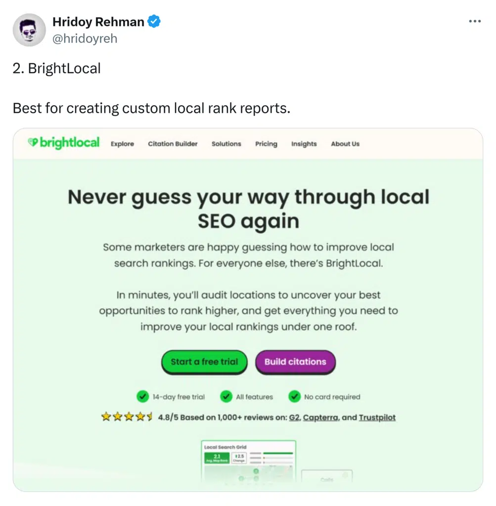 I took a quick look at what people are saying about BrightLocal online. Hridoy Rehman, the founder of Growth Boilerplate and a well-known SEO expert, shared his top five local rank tracker tools and ranked BrightLocal second.