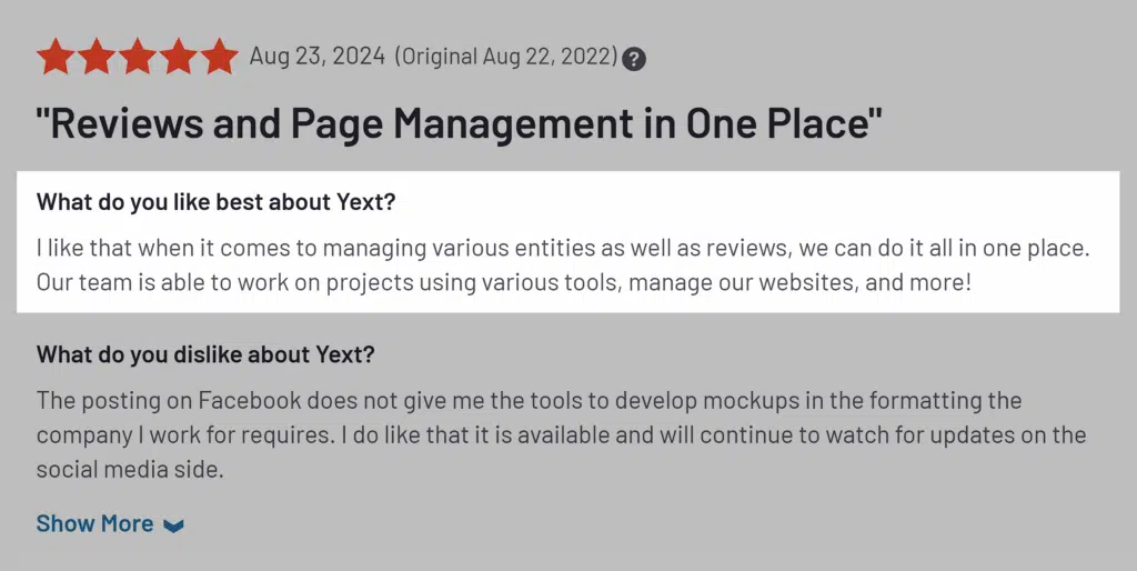 On review sites like G2, users praise Yext’s ease of setup for new locations, all-in-one review and page management, bulk data management, and automated reporting.