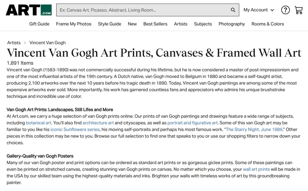 For example, if you’re focusing on “Van Gogh,” you could create a content hub with cluster articles such as “Van Gogh’s Most Famous Works” and “The Impact of Van Gogh’s Work.”