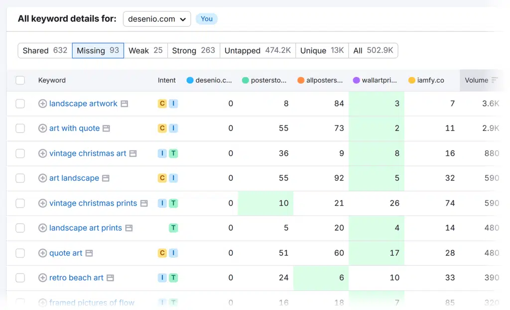 For example, if a competitor ranks for “framed Van Gogh prints,” you should create high-quality, relevant content to fill that gap.