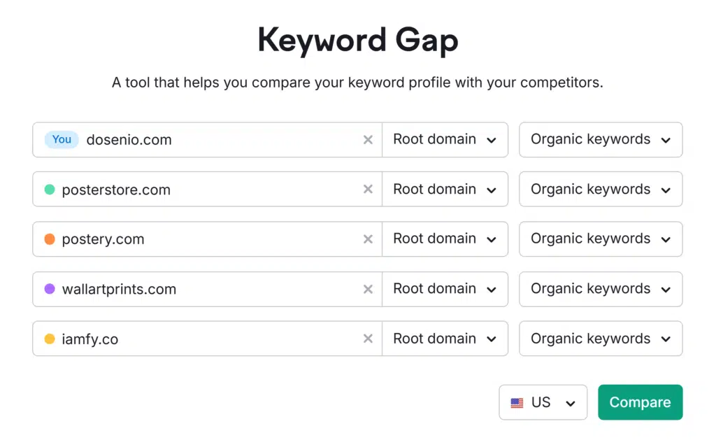 So, if you have a website like desenio.com that isn’t near the top 10 for your target Van Gogh terms yet, and you’re not quite sure who your biggest competitors are, SEO software can help. (And if you’re comparing Semrush vs. Similarweb, Semrush is the way to go when it comes to competitor research tools.)