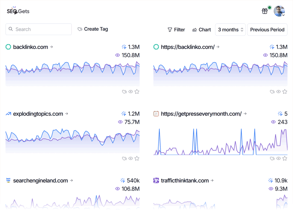Note: A powerful alternative to GSC for performance tracking is SEO Gets. It’s a premium tool, but it lets you easily switch between client sites and get a quick performance overview. I only didn’t include it here because it can’t help with the indexing issues that GSC can handle.