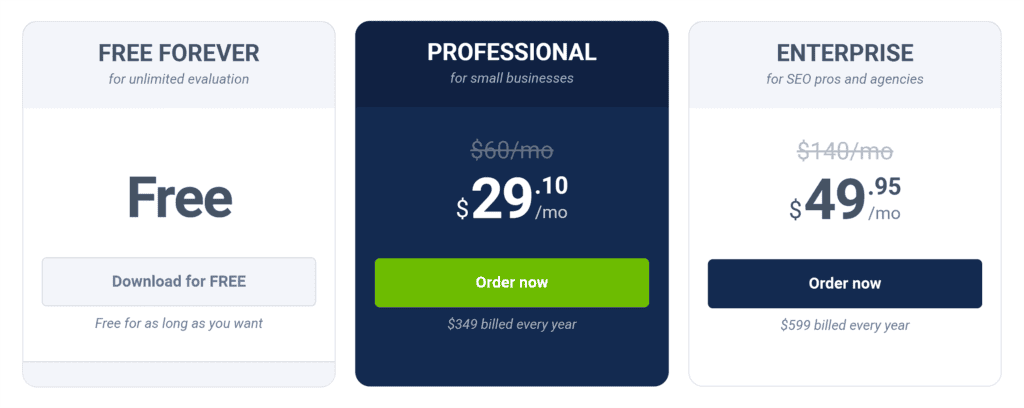 SEO PowerSuite offers two pricing options, with both being cheaper than SpyFu’s equivalents. The Professional plan is best suited for small businesses and is equivalent to $29.10/month, but it’s billed annually.